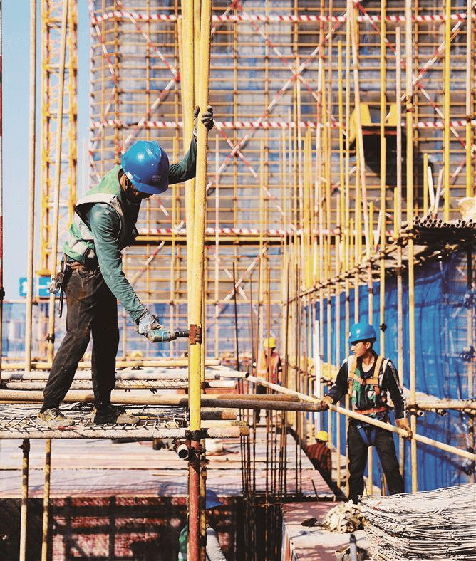 当泵里的混凝土倾泻而出,混凝土工便推着抹平机拍马赶到,机器隆隆驶过,将不平整的浆体推平,留下光滑的表面;不远处,数以百计的钢筋纵横交错,构成了建筑物的骨架,钢筋旁,工人们弯腰俯身,用铁丝将其间每一个交叉点绑紧,确保钢筋牢固可靠;三四个架子工在所有工人的头顶上,如走钢丝般穿梭在建筑物最顶部的边缘区域,用扳手对着一根又一根的脚手架进行拼接固定作业,编织起这栋建筑向上生长的外骨骼。